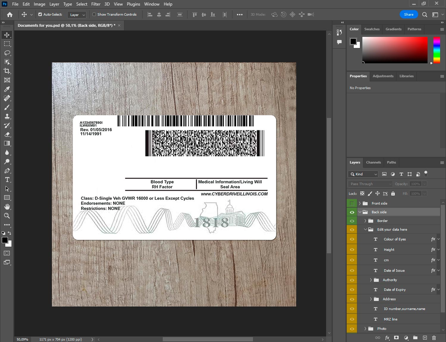 -Illinois drivers license template front.psd + back.psd
